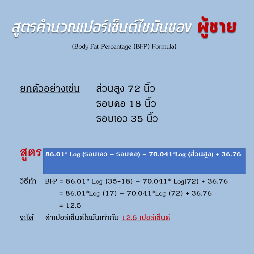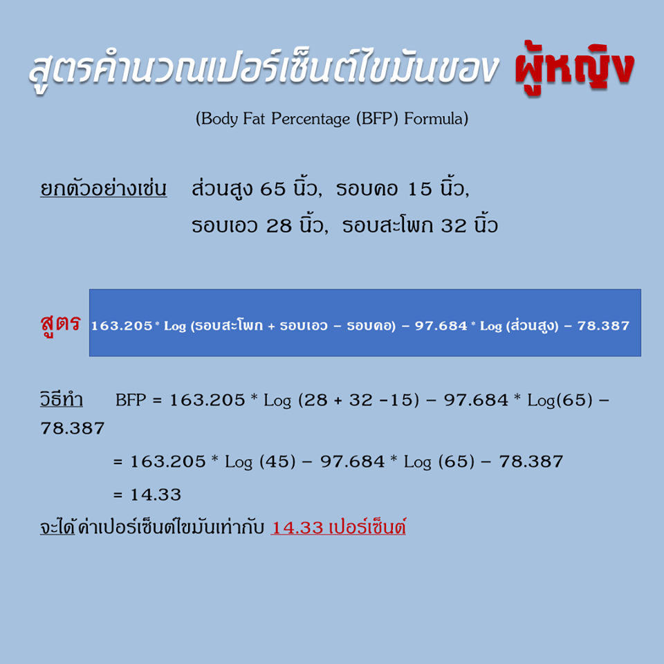 ในวันนี้เรามีสูตรคำนวณเปอร์เซนต์ไขมันอย่างง่ายมาฝากกันค่ะ สำหรับใครที่ไม่สะดวกวัดด้วยเครื่องวัดองค์ประกอบของร่างกาย (Body Composition Analyzer) หรือยังไม่มีอุปกรณ์หนีบไขมัน (skinfold caliper) ก็สามารถใช้สายวัดตัวที่มีอยู่ในบ้านวัดแทนได้เช่นกันค่ะ